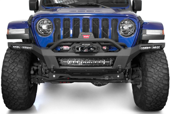 The Phantom Series Winch Front Bumper prepares your rig for off-road driving with its various lighting and recovery options. Recovery options include a standard sized heavy-duty winch mount and D-ring mounts. For supplemental lighting, you have a variety of options. You can mount one center 20-inch LED light bar, a pair of side 10-inch single row LED light bars, and a pair of cube or round lights above the bumpers bull bar.The Phantom Series Front Bumper follows the body lines and factory fenders with the tightest of tolerances. This low profile bumper was designed to improve ground clearance over the factory bumper. A heavy-duty 3/16 in. aluminum skid plate is included with the bumper and helps to guard your sway bar disconnect from damage. The durable dual-stage hammer black powder coat finish and satin black aluminum accent panels offer a modern and sleek look that highlights your rig's factory lines. Made from high quality materials, this bumper is built for the trail. As always, our bumpers are proudly made in the USA.