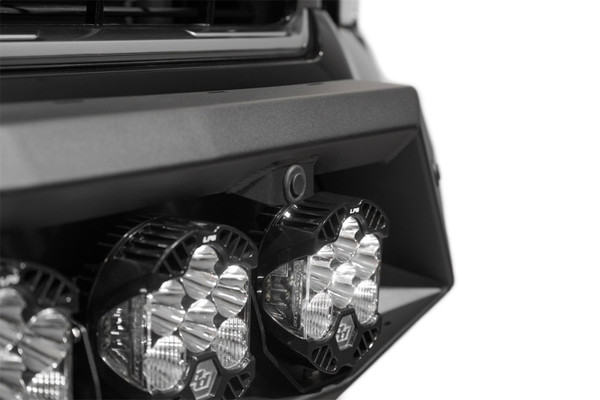 "Our Front Bumper offers off-road utility and an elevated styling. The center cutout fits either five Baja Designs LP6 lights or six RIGID Industries 360 Series 6 in. round lights, or two radiused 40-inch light bars. Additional lighting options are provided by 3-inch cube light mounts in the wings. The bumper features a winch mount and two 1-inch thick D-ring mounts. It retains the OEM parking sensors and adaptive cruise control. The bumper is constructed from steel and finished in a 2-stage hammer black powder coat. It is fully bolt-on and made in the USA.