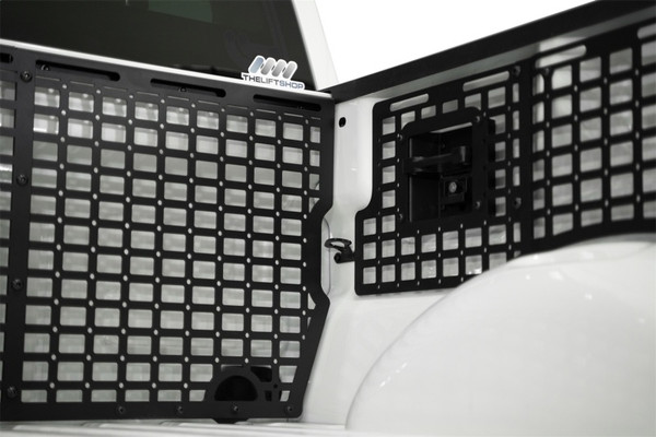 Our Bed Cab Molle Storage Panels are the ultimate cargo solution for those who need effective truck bed storage solutions. Our Molle Panels provide a versatile platform for attaching and organizing your trail gear. They are compatible with a range of attachment systems including quick fist mounts, molle straps, bolts, and other tactical solutions. The panels were designed to closely follow the contours of the truck bed, with a fitment unrivaled by others. The factory tie down points are retained, and additional tie-down options are provided by our system. Manufactured from American steel, these panels maximize cargo storage by utilizing vertical storage space to keep the truck bed free for larger loads. The panels are ideal for storing gear such as shovels, hi-lift jacks, fluid tanks, recovery gear, and more. Our panels are finished with a hammer black powder coat, bringing a sleek style and providing resistance to the elements. Multiple mounting points ensure the panels are rigid and secure, yet are easily removable if needed. As always, these are Made in America. The Bed Cab Molle Panels can be configured in 4 ways: Driver, Center, & Passenger Side Full Set / Driver Side Panel Only / Passenger Side Panel Only / Driver & Passenger Side Panels Only * Please Note: Center panel cannot be installed on its own. It requires BOTH the driver and passenger side panel for installation. ** Please Note: Some drilling is required for installation.
