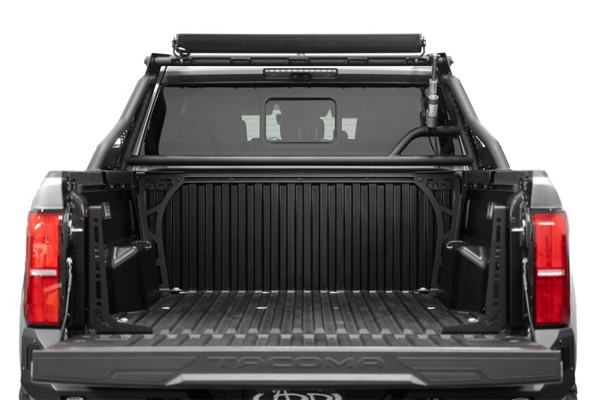 Our Race Series 2024 Tacoma Chase Rack is designed to elevate your truck's styling while providing you with supplemental lighting and gear mounting capabilities. The rack's precise fitment follows the contours of your Tacoma, complimenting its sleek factory design. For forward or rear facing lighting options, our rack features an integrated actuated light bar mount that can face lights towards either direction for different lighting preferences. You can raise or lower the light mount from the comfort of your cab when needing to adjust your truck's clearance for garages or tight spaces. The mount can fit up to one 40-inch light bar or five round lights, along with other combinations. The durable design of the chase rack and the included bed cab corner braces add additional rigidity and further strengthen your truck bed when adventuring off-road. Made from American steel, this rack will withstand the toughest terrain. The resilient dual-stage hammer black powder coat finish with satin black lightweight aluminum side panels provide utility and an aggressive style to your Tacoma. As always, ADD's chase rack is proudly made in the USA.