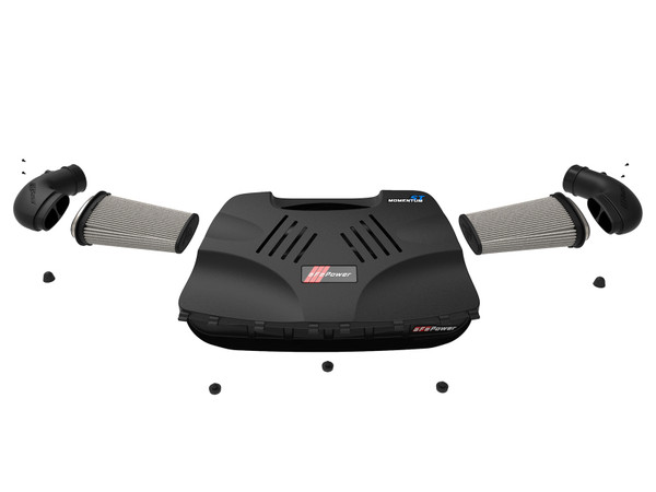 The smooth one-piece sealed housing is used to eliminate the use of multiple-piece housings and ensure the coolest air intake charge available. This System uses a CAD designed, dyno-tuned, roto-mold intake tube to achieve maximum power gains while maintaining a perfect fit. The Momentum ST intake is designed around an oil-free, large 9" Tall conical flat top 360 degree radial flow performance air filter with 3-layers of progressive finer porosity synthetic media providing maximum convenience. The unique air filter-to-housing interface (patent pending) allows for maximum filter size which increases the available air volume while simplifying the installation process. Premium stainless steel worm gear clamps and a silicone coupler are used for strength and durability while also providing the most secure installation available. Momentum ST intakes are designed with fewer parts for a quick and simple installation.