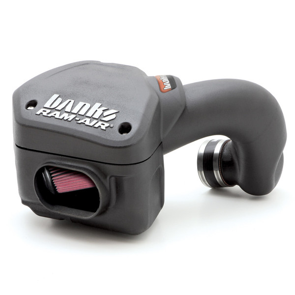 Flowbench developed, dyno proven. Improves airflow up to 33% . Huge cold-air inlet and extra large outlet. Intake tube shaped by CFD software. Cooler temps, less smoke and more MPG.Banks Ram-Air Superiority. Increase Power and MPG. Banks Ram-Air Intake System replaces the factory's flat panel filter with a large conical filter that provides maximum high-flow filtration. The Ram-Air's opening dwarfs the stock's inlet. The huge inlet, enclosed housing and much larger tubing reduce restrictions, dramatically improving airflow to the cylinders. Intake tube shaped by CFD software. Please note: This Ram-Air intake system Cannot be installed on a vehicle that has the Banks Brake. New Filter Options! Choose from the traditional red, Oiled filter or the all-new black, Dry filter. Ram-Air Cold-Air Intake System, Oiled or Dry Filter for use with 1994-2002 Dodge 5.9L