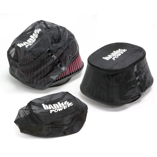 Highly recommended in dirty environments. Keep your Ram-Air Filter protected from large debris, bugs, mud, etc... Built from a breathable material, the Banks Pre-Filter goes over your air filter, provides additional protection, and can even extend cleaning intervals. Works with both Dry and Oiled filters.Banks pre-filter wraps are designed to work with your Ram-Air intake system and are constructed from a polyester mesh with uniform micron openings.It improves the filtering of larger debris and dirt by preventing them from getting embedded into the filter. This allows your your Banks Ram-Air to breathe easier for longer by increasing the time between services.Its hydrophobic surface has been treated to repel water and improve performance in humid or wet environments. The pre-filter is able to resist heat up to 400 degrees Fahrenheit and will not shatter in freezing temperatures.