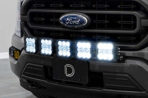 FeaturesBolt-on fitment compatible with Ford F-150 2021+Ultra-high intensity with custom-engineered TIR opticsSelectable backlight color with eight color optionsTorture-tested heavy-duty constructionControl through factory aux switch bank using the included harnessAssembled in USA OverviewPerfect Fitment. The Grille CrossLink Lightbar Kit compatible with Ford F-150 2021+ from Diode Dynamics allows you to mount five linked SS5 LED pods on the factory grille. These application-specific brackets were CAD-designed to bolt into place using factory mounting points on the grille. No cutting or drilling required!Designed for Performance. Featuring the highest output intensity of any 5-inch LED pod on the market these lamps have been designed for maximum functionality with patented technology and custom-engineered TIR optics all in a durable package.Selectable Backlight. The Stage Series 5inch LED Pods included in the White kit feature a selectable backlight with eight different color options perfect for an extra styling accent or for more visibility when you(TM) re not using the main beam. Selecting your backlight color is easy - simply alternate the power on and off. There(TM) s no complicated programming with a controller! The SS5's backlight fully illuminates the TIR optic providing unique accent lighting that you won't find on other LED pods. NOTE: Due to the yellow lens the Yellow kit is only available with an Amber backlight color.CrossLink. Our patent-pending CrossLink technology allows you to link up to eight SS5 pods together to create your own lightbar. The single-piece CNC aluminum link provides extreme rigidity but is fully adjustable. This kit was designed for a curved configuration.