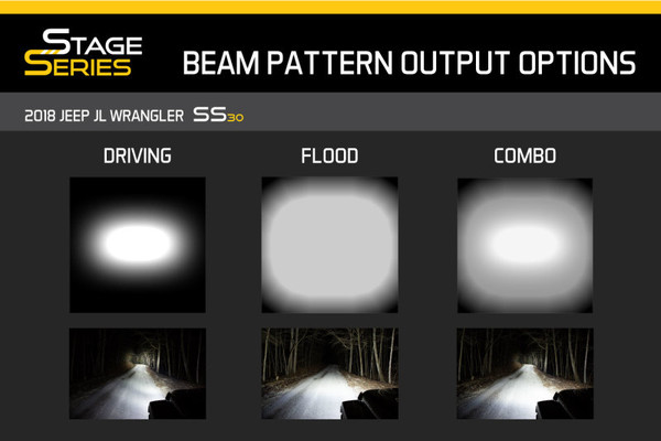 The Driving pattern was designed to supplement your high beams. Rather than a simple spot pattern the Stage Series Driving pattern has a rectangular 30x20 degree pattern that is far more useful for directing light downrange at high speeds.