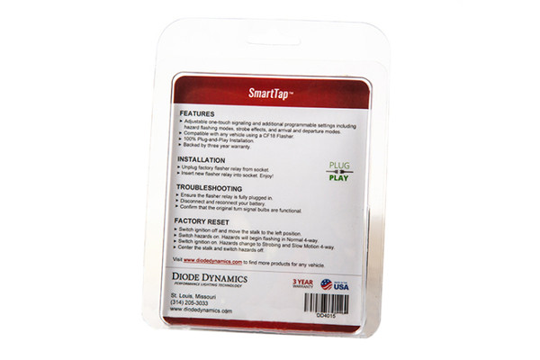 FeaturesAdds unique programmable functionsCompatible with LED or standard bulbs no hyperflashPlug and play swap for original moduleAssembled in USA 3 year warrantyA Smarter FlasherThe SmartTap is a replacement turn signal flasher relay compatible with any vehicle using a CF18 (LM449) Flasher. With plug-and-play installation it offers a lot more than your average relay: an embedded microcontroller is loaded with exclusive software which adds new features to your vehicle! You can program the features just the way you'd like with the help of the included programming guide.Tap-to-Signal: Anytime the turn signal is tapped the turn signal will blink a number of times automatically. This one-touch signaling is a convenient way to signal other drivers when switching lanes. The number blinks is programmable to make it as long or short as you'd like.Unique Hazard Functions: The SmartTap has built-in strobe slo-mo and wig-wag hazard functions to help your vehicle stand out when the hazards are on. Apply these functions on their own together or with the strobe setting for a total of eight unique hazard functions!Arrival and Departure Modes: When the lock or unlock button is pressed your turn signals will stay on in a steady glow for better visibility when approaching or leaving the vehicle at night. The lighting time can be adjusted from 10-90 seconds for additional illumination or disabled if desired.This product was designed programmed and assembled by Diode Dynamics in St. Louis Missouri USA.
