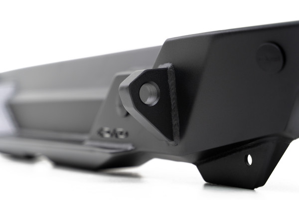 Our FS-15 Rear Bumper features a low profile design suited for aggressive rock crawling. The bumper includes a license plate relocation bracket with a license plate light. The factory hitch and harness fit perfectly in an accessible position beneath the FS-15. For models equipped with factory sensors, we included sensor cutouts to retain full functionality of the feature. For models without factory sensors, we include sensor hole plugs for a clean look. Up to a 37-inch spare tire will fit on the Original Manufacturer carrier above the bumper.