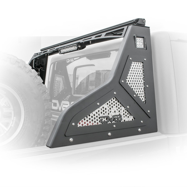 The DV8 Offroad RRGL-01 Chase Rack is a completely bolt on rack that features multiple mounting options for lights. The rack bolts securely to the bed of the gladiator and completely enhanced the looks of the truck. This rack also features mesh aluminum accents that can be unbolted and color keyed to match your vehicle or theme. This rack features the option to mount a 50 inch light bar behind the cab where wind noise is much less of a factor than a standard windshield mount light bar. Features: 20-Present Jeep Gladiator, Multiple lighting configurations, Textured 3 stage powdercoat, steel construction, Light weight, Bolt-on installation, Standard DV8 warranty.