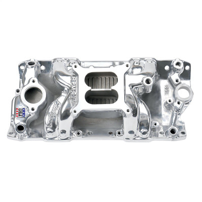 Edelbrock part #7561 RPM Air-Gap 2-O intake manifold is designed for street 396-502 c.i.d. Chevy V8's with large oval-port cylinder heads (1975 and earlier) or Edelbrock Performer/Performer RPM heads. This RPM Air-Gap incorporates the same race-winning technology that's been used on our Victor Series competition intakes for decades. The Air-Gap design features an open air space that separates the runners from the hot engine oil resulting in a cooler, denser charge for more power. Includes rear water outlets, two distributor clamp locations and nitrous bosses. Accepts all late model alternator and A/C brackets for the street. For square bore carburetors only. Will not fit under stock hood of Corvette, 1964-67 Chevelle or 1967-81 Camaro. No provision for exhaust heated chokes and no exhaust crossover.