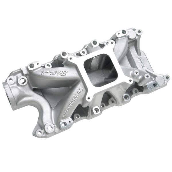 Edelbrock part #29285 Super Victor 8.2 EFI intake manifold is designed for high-rpm and competition 302-347 engines with aftermarket Windsor-style racing cylinder heads such as the Edelbrock Victor heads #77219 or Victor Jr. heads #77169. The Super Victor 8.2 is for engines with a standard 8.2" deck height and features a single-plane, high-rise intake design for maximum race-winning power. This intake manifold is ideal for use with large displacement drag racing engines. It delivers big power gains from 4500 to 8500 rpm and includes rear cooling water bosses. The square-bore carburetor pad stands .850" taller than the Edelbrock Victor Jr. #2921.