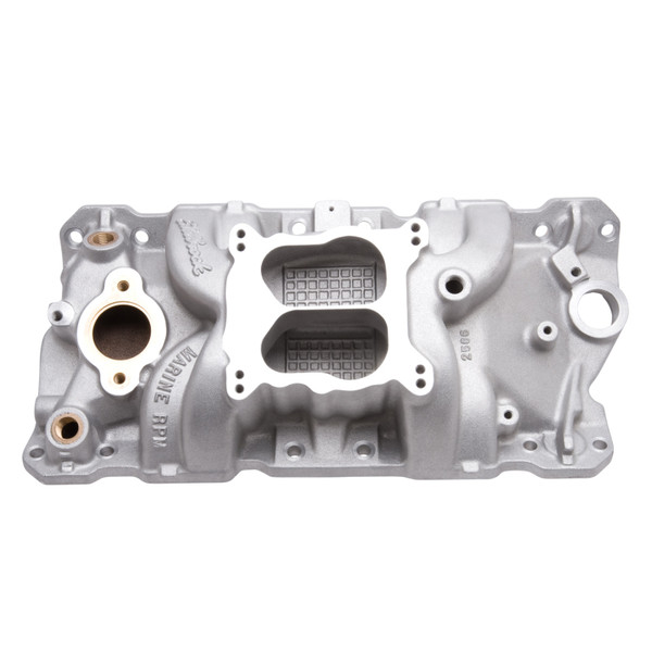 Edelbrock part #2506 Performer RPM Q-Jet marine intake manifold is designed for 1987-95 262-400 c.i.d. Chevy V8's for spread-bore (Q-Jet) or square-bore carbs. The Edelbrock Performer RPM Q-Jet #2506 intake manifold is designed specifically for demanding marine applications and delivers maximum power and a broad torque curve for high-performance marine. Delivers maximum power and a broad torque curve for high-performance marine. Carb pad will accept square-bore carbs without adapters. The Performer RPM Q-Jet marine intake manifold features brass lined front water crossover and brass flange inserts to cover the rear water openings.