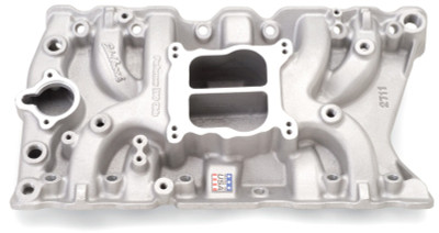Edelbrock part #2812 Victor Oldsmobile intake manifold provides power levels never before available for competition single-carb 350-403 Olds engines. Featuring a single-plane "Air-Gap" design, it accepts square-bore carb and offers significant horsepower increases over existing intakes in the 4500 to 7500 rpm range. It features a carb mount pad height of 7" and high-flow constant area 3.2-square-inch runners. The runners have been optimized to match the flow characteristics of Edelbrock Performer RPM aluminum cylinder heads #60519 and the exit size, as-cast, is 1.28" by 1.94" with plenty of metal thickness for gasket matching and porting.