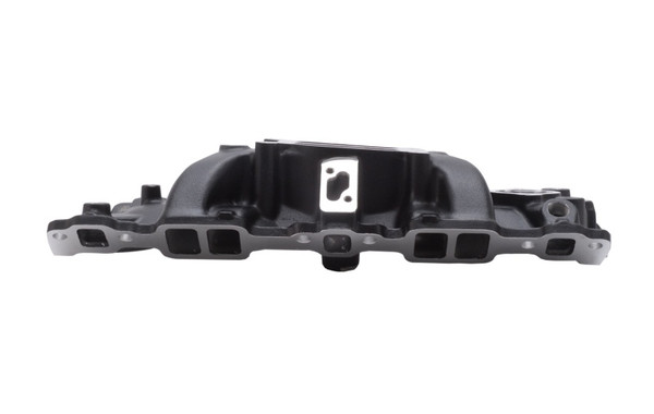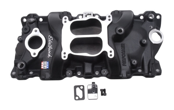 Edelbrock part #21043 Performer intake manifold is designed for street 262-400 c.i.d. Chevy V8's that have heads with canted center bolt holes, 1987-1995. This Manifold accepts late-model water neck, air-conditioning, alternator, H.E.I., has rear water crossovers and accepts exhaust-heated chokes. For 1987-95 stock aluminum heads use #2101. Will not fit Chevrolet Bowtie or LT1 heads. This manifold offers a durable black power coated finish for long lasting protection and a distinctive look.