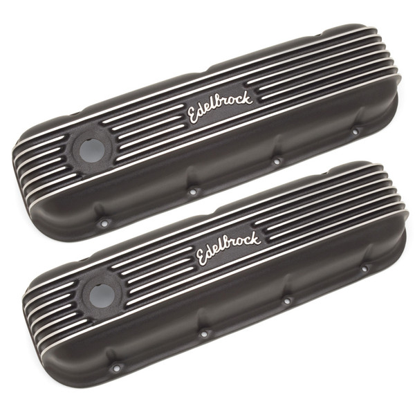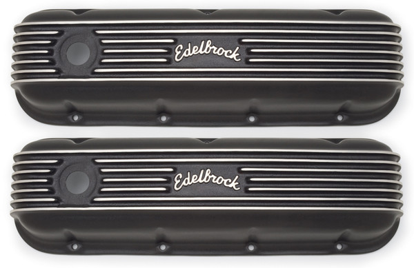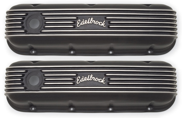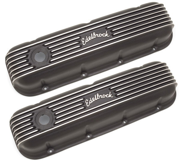 Edelbrock part #41853 Classic Series Valve Covers are designed for Chevy Big-Block V8 1965 & Later applications and have a Black finish. Edelbrock first made these aluminum valve covers in the late '50s and they're still a classic. Made of heavy-gauge sand-cast aluminum, Overall height is measured from base to top at the highest point. Edelbrock classic valve covers can be machined to accept breathers if desired.
