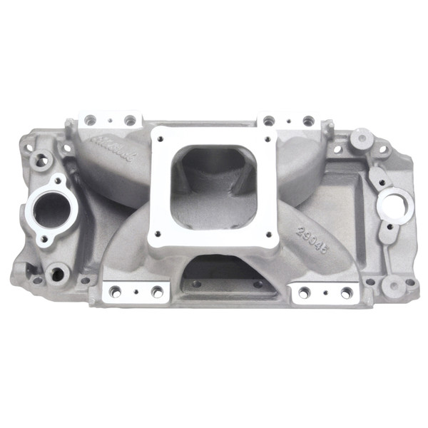Edelbrock part #29045 Victor Jr. 454-O EFI intake manifold is designed for competition 396-502 big-block Chevy engines with large oval-port cylinder heads (1975 & earlier). Features include extended runner dividers, smaller plenum chambers and unique runner design for better 60 foot times and max power from 3500 to 7500 rpm. This intake manifold is especially suited to 502 c.i.d. and smaller competition engines. The Edelbrock Victor Jr. 454-O EFI intake manifold is a single-plane design with a 4150 flange and can be used with standard deck blocks from 1965 to present. It is designed to be matched with our Edelbrock/Musi Victor 24 degree Pro-Port CNC heads #61419 or #61409 for 950+ hp out-of-the-box potential!