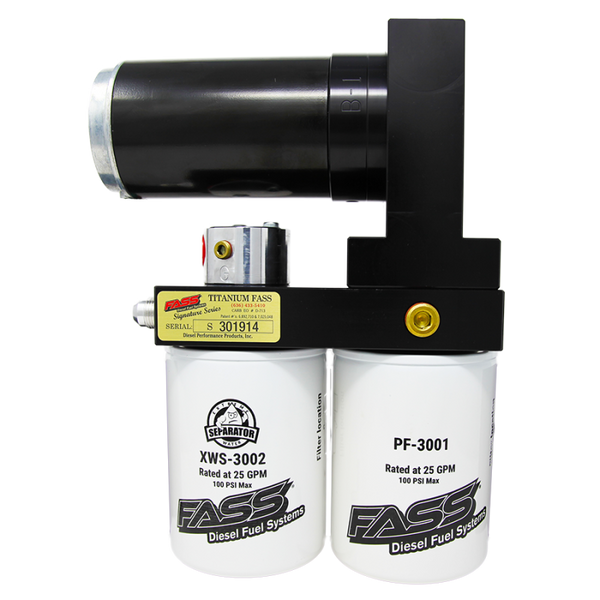 A Titanium Signature Series fuel System also offers advanced filtration benefits that will help protect your 12 valve's injection Systems, effectively extending the life of both your P-System and Bosch Diesel Injectors. These Benefits include an improved filtration rating of 2 Microns, a built-in water separation filter and FASS Diesel Fuel Systems patented air/vapor removal process.