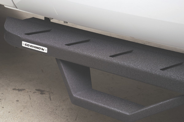 The legendary RB Series of cab length running boards from Go Rhino will make your truck, Jeep or SUV stand apart from the crowd. With an aggressive, yet stylish appearance, these bolt-on steps take their visual inspiration from the Ford Raptor but are made for more than just looks. The RB10 features a generous step area with Raptor-style louvers for maximum traction. The corrosion-resistant 16-gauge zinc coated steel steps are mounted high and tight, giving them plenty of clearance for off-road adventures, and are strong enough to support hundreds of pounds. The RB10 is offered in textured black powder coat or rugged, bedliner coating. One or two pairs of drop steps will make entering and exiting lifted vehicles even easier. Hardware and brackets are included. RB10 Running Boards With Drop Steps come with a Limited Lifetime warranty on materials and construction and a 5 year warranty on the Textured Black Finish.