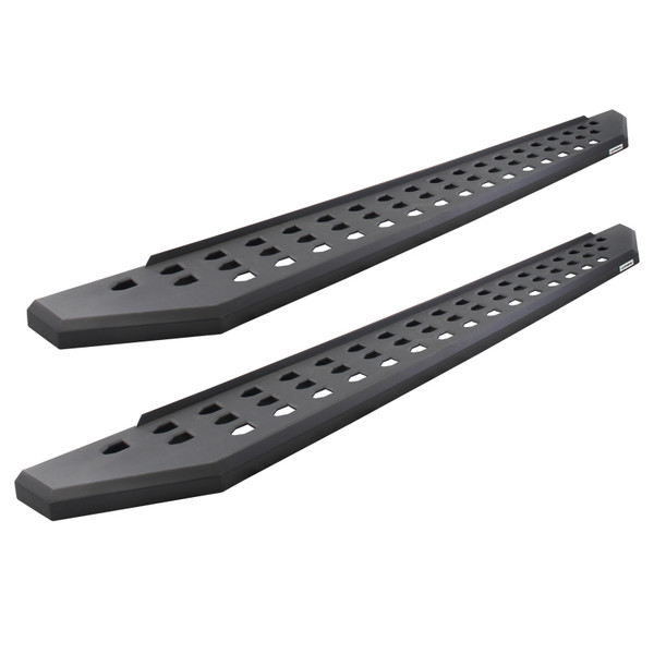 Go Rhino's legendary RB20 cab length running boards will make your truck, Jeep or SUV stand apart from the crowd. With an aggressive, yet stylish appearance, these bolt-on steps take their visual inspiration from the Ford Raptor but are made for more than just looks. The RB20's perforated holes, punched into the surface of the step, gives maximum traction and prevents mud, ice, and snow from accumulating. The corrosion-resistant 16-gauge steel steps are mounted high and tight, giving them plenty of clearance for off-roading, and are strong enough to support hundreds of pounds. The RB20 is offered in textured black powder coat or bedliner coating. Matching drop steps will make entering and exiting lifted vehicles even easier. Hardware and brackets are included. RB20 Running Boards With Drop Steps come with a Limited Lifetime warranty on materials and construction and a 5 year warranty on the the Textured Black Finish.