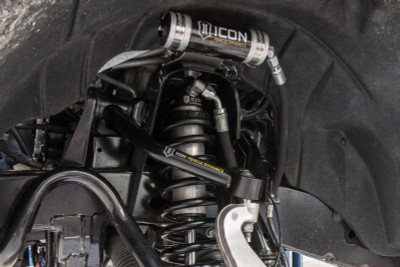 ICON Vehicle Dynamics V.S. 2.5 Series remote reservoir rear coilover shocks are an incredible upgrade for the rear end of the 2021-2023 Ford Bronco. These adjustable coilovers allow up to 2-3” of rear lift height adjustability on 4-door Broncos without the Sasquatch package or 1.25-2.25” of rear lift over stock 4-door Sasquatch equipped Broncos, allowing the use of larger, more aggressive wheel and tire combinations. ICON’s Vehicle-specific shock length and valving along with the larger 2.5” shock body and increased piston area over stock components yield the maximum travel possible along with superior ride quality and suspension performance both on- and off-road. Reservoirs greatly increase shock oil volume and heat dissipation surface area to resist overheating and cavitation under hard use, which can lead to damper fade. These rear coilovers are mounted in a shaft up orientation and feature unique ICON engineered progressive triple rate coil springs, allowing for softer spring rate at ride height that ramps up as the coil compresses for improved bottom out resistance. This shaft up orientation also requires the reservoir hose to be routed along the rear lower links so ICON offers hose bracket options for the OE or ICON tubular links while ICON billet links incorporate this bracketry into their design. When paired with ICON 2.5 Series front coilovers vehicle control will be balanced front to rear, resulting in the best overall driving experience for your Ford Bronco.