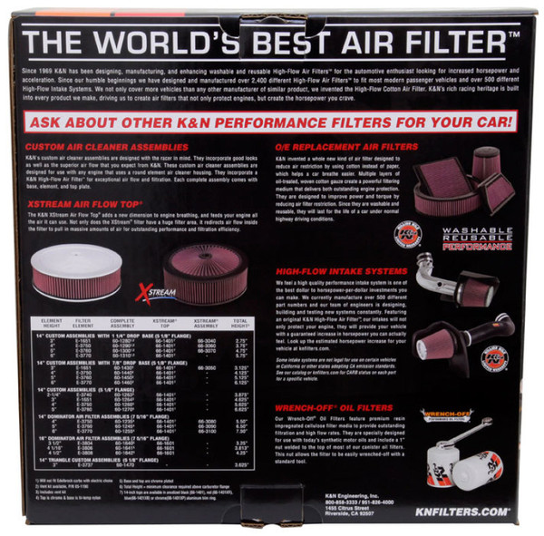 K&N's custom air cleaner assemblies are designed with the racer in mind. They incorporate good looks as well as the superior air flow that you expect from K&N. These custom air cleaner assemblies are designed for use with any engine that uses a round element air cleaner housing. They incorporate our famous K&N Air Filters and provide more air flow than other assemblies of this type. Available in 4 different designs, the perfect assembly is sure to be found here. Each complete assembly comes with base, element, and top plate.
