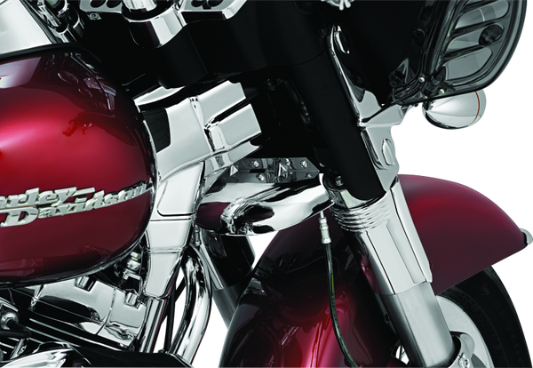 Just the right touch of edge and functionality. Hide those welds and wires in one quick and easy step. Kuryakyn Neck Cover Kits customize the frame's steering neck and down tubes with easily installed chrome covers.