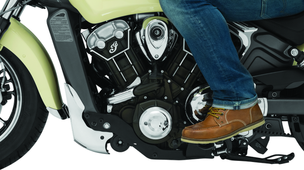 Kuryakyn mid-control kits relocate the stock forward placement of the foot pegs on your Indian Scout motorcycle back 15 in. This allows the rider to be in a more comfortable, more aggressive riding position. These kits use a combination frame and engine mount kit with full steel construction for strength and durability. The factory peg mounts, rear brake master cylinder, brake lever, and shift lever all get relocated. Kuryakyn mid control kits include a shift linkage, MX-styled knurled short pegs for greater ground clearance, and all mounting hardware.