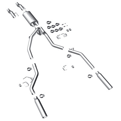 The MagnaFlow 2009-2021 Toyota Tundra Street Series Cat-Back Performance Exhaust System 19232 brings out the personality of your 4.6L, 4.7L, 5.7L 2009-2021 Toyota Tundra with our signature resonant, powerful engine tone and dyno-proven performance. Thanks to its fast-flowing, mandrel bent 2.5in. main piping and 1 Straight-Through mufflers ending in a Dual Split Rear Behind Rear Tires exit with 4in. Polished Clamp-On Double Wall Angle Cut Rolled Edge tips, this Toyota Tundra exhaust kit has the performance chops to match its sporty sound and appearance. Upgrade your ride to the next level with an exhaust that has the pipes to put other Toyota Tundra's to shame. With this system your vehicle will be producing Aggressive exterior and Moderate interior sound levels while leaving other cars and trucks feeling envious at every stoplight. Exhaust kit 19232 features a cat-back layout that replaces your ride's stock exhaust components from near the catalytic converter on back. Extensive 3D scanning during development has resulted in a direct-fit design that you can easily install yourself. 19232 is produced using CNC precision robotic manufacturing techniques and is backed by MagnaFlow's 1-year limited finish warranty and limited lifetime construction warranty.