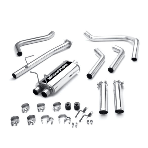 The MagnaFlow Street Series Cat-Back Performance Exhaust System 15796 brings out the personality of your Truck with our signature resonant, powerful engine tone and dyno-proven performance. Thanks to its fast-flowing, mandrel bent 2.5in. main piping and 1 Straight-Through mufflers ending in a Dual Split Rear exit with 3in. Polished Clamp-On Single Wall Angle Cut Edge tips, this Truck exhaust kit has the performance chops to match its sporty sound and appearance. Upgrade your ride to the next level with an exhaust that has the pipes to put other Truck's to shame. With this system your vehicle will be producing Aggressive exterior and Moderate interior sound levels while leaving other cars and trucks feeling envious at every stoplight. Exhaust kit 15796 features a cat-back layout that replaces your ride's stock exhaust components from near the catalytic converter on back. Extensive 3D scanning during development has resulted in a direct-fit design that you can easily install yourself. 15796 is produced using CNC precision robotic manufacturing techniques and is backed by MagnaFlow's 1-year limited finish warranty and limited lifetime construction warranty.
