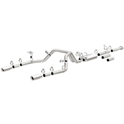 The MagnaFlow Street Series Cat-Back Performance Exhaust System 16741 brings out the personality of your Truck with our signature resonant, powerful engine tone and dyno-proven performance. Thanks to its fast-flowing, mandrel bent 3in. main piping and 1 Straight-Through mufflers ending in a Dual Split Rear exit with 3.5in. Polished Clamp-On Single Wall Angle Cut Rolled Edge tips, this Truck exhaust kit has the performance chops to match its sporty sound and appearance. Upgrade your ride to the next level with an exhaust that has the pipes to put other Truck's to shame. With this system your vehicle will be producing Aggressive exterior and Moderate interior sound levels while leaving other cars and trucks feeling envious at every stoplight. Exhaust kit 16741 features a cat-back layout that replaces your ride's stock exhaust components from near the catalytic converter on back. Extensive 3D scanning during development has resulted in a direct-fit design that you can easily install yourself. 16741 is produced using CNC precision robotic manufacturing techniques and is backed by MagnaFlow's 1-year limited finish warranty and limited lifetime construction warranty.