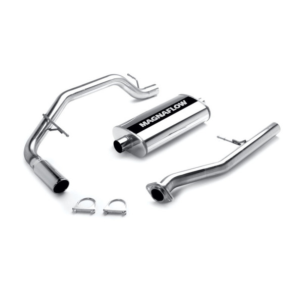 The MagnaFlow Street Series Cat-Back Performance Exhaust System 15665 brings out the personality of your SUV with our signature resonant, powerful engine tone and dyno-proven performance. Thanks to its fast-flowing, mandrel bent 3in. main piping and 1 Straight-Through mufflers ending in a Single Passenger Side Rear exit with 4in. Polished Welded-On Single Wall Angle Cut Rolled Edge tips, this SUV exhaust kit has the performance chops to match its sporty sound and appearance. Upgrade your ride to the next level with an exhaust that has the pipes to put other SUV's to shame. With this system your vehicle will be producing Moderate exterior and Mild interior sound levels while leaving other cars and trucks feeling envious at every stoplight. Exhaust kit 15665 features a cat-back layout that replaces your ride's stock exhaust components from near the catalytic converter on back. Extensive 3D scanning during development has resulted in a direct-fit design that you can easily install yourself. 15665 is produced using CNC precision robotic manufacturing techniques and is backed by MagnaFlow's 1-year limited finish warranty and limited lifetime construction warranty.