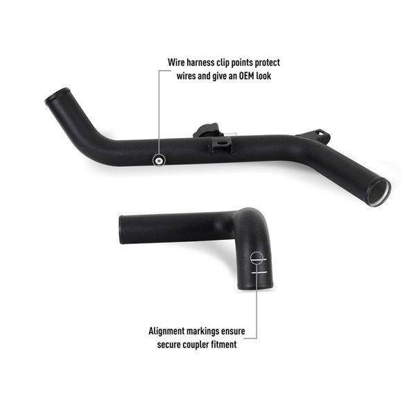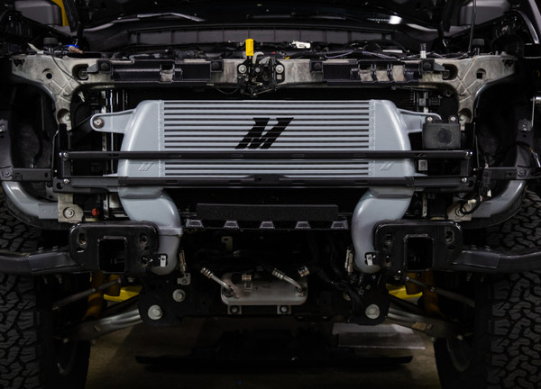 Unleash your 2021+ 2.7L EcoBoost Ford Bronco’s full potential with the Mishimoto High-Mount Intercooler Kit! Designed to allow your Bronco to breathe the coldest, densest air possible, this high-mount intercooler kit is comprised of our high-mount intercooler and performance intercooler pipe kit.----We’ve relocated the intercooler to the upper grille to allow better airflow at all times, even with winches, light bars, or larger bumpers installed. This location also helps protect the intercooler from obstacles on the trail. Our intercooler utilizes a 3.1 inch-thick bar-and-plate core that’s precision TIG welded to cast aluminum end tanks for superior durability and heat soak resistance. The weak plastic stock piping is replaced with high-flowing, durable cast and mandrel-bent aluminum piping and silicone boots with DuraCore technology. The larger volume of our pipes allows your 2.7L EcoBoost to breathe freely and make the most of its turbos, while the all-aluminum construction and DuraCore boots provide unmatched durability.----Durability is always a good thing, but it’s even better when it’s paired with performance. The high-mount intercooler boasts a 49-percent greater core volume and 93-percent greater external fin surface area than stock, which results in 21-degree cooler outlet temps over the stock intercooler. When combined with the intercooler pipes' 34-percent reduction in restriction, this kit produces power gains of 11.6 HP and 13.7 lb-ft. of torque on the stock tune.----This intercooler kit is available with a stealth black or sleek silver intercooler and micro-wrinkle black powder coated pipes. Functionality of adaptive cruise control is retained utilizing a relocation bracket and 360-degrees cameras are unaffected. As with all our products, the Mishimoto 2021+ Ford Bronco 2.7L High-Mount Intercooler kit is backed by our signature Mishimoto Lifetime Warranty and comes with all necessary hardware for easy installation.
