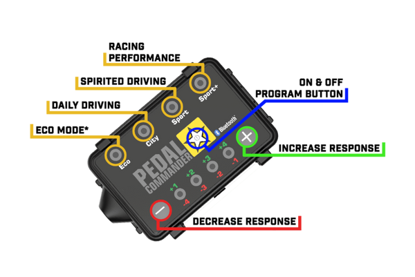 Why do you need Pedal Commander?Pedal Commander is a throttle response controller. It removes response delays on your electronic accelerator pedal. Effectively, it allows your engine to respond faster. As a result, your car can accelerate faster. You paid lots of money for your car, but when you press your gas pedal, you feel like you are pressing a sponge. Have you ever noticed that old cars were more responsive?We have a solution for you!! to get rid of that lag.Pedal Commander has 4 different control modes: Eco, City, Sport, and Sport. Each control mode has 8 different sensitivity levels which you can choose. These 36 different parameters, in total, is what makes us different than others. Pedal Commander is programmable according to your desire to your car’s specifications. And now Available with Bluetooth capability.User Friendly Bluetooth Control
