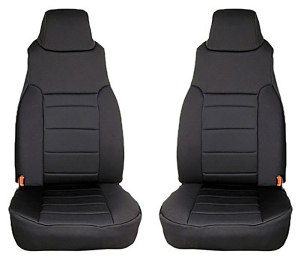 Custom Fit Neoprene Seat Covers. These covers are constructed of durable neoprene creating the best looking custom seat cover available. Rugged Ridge does not use that cheap stretch nylon on their seat covers! Neoprene (wet suit material) is a great fabric to protect your seats from dirt, water and whatever mother nature can throw at you. No more burned legs from hot vinyl seats! Each cover is custom tailored for your Jeep's original equipment seat style making your seats look like they have been recently reupholstered. Installation is easy with special designed elastic cords, nylon straps and hooks that attach to your seat and to the seat cover mounting points. The center portion (color) goes all the way to the top of the seat.