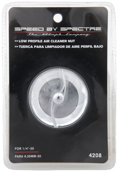 Spectre's Low Profile Air Cleaner Nut is a triple-chrome plated nut designed to offer maximum hood clearance. Only 0.35 inches thick, this part features a unique flush design that adds no extra height, while still offering easy and accessible grip for convenient and effective tightening. With threading that is compatible with the majority of carburetors, this part has been engineered for optimum fit and function.