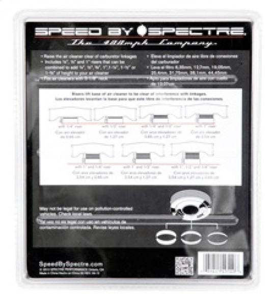 Spectre's Air Cleaner Riser Kit fits air cleaner and carburetor combinations with 5-1/8 inch diameter necks and was designed to space air cleaners above chokes, linkages, and more. This kit includes 3 riser rings measuring 1/4 inch, 1/2 inch, and 1 inch and can be stacked for increased heights. Manufactured using high quality materials this product is engineered for optimum fit and function.
