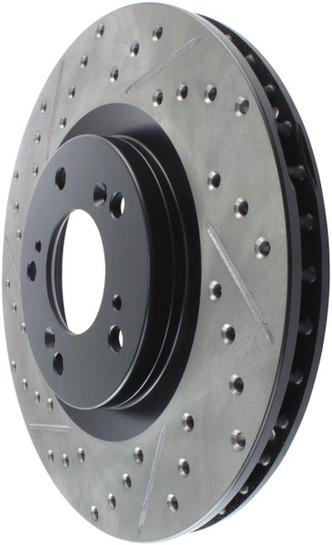 StopTech Drilled and Slotted Sport Rotors are 1-piece direct replacement brake discs for factory brake systems and stock calipers that look great behind your wheels and offer significantly improved braking performance. The unique cross-drilling and slotting aids with heat and brake dust dispersal; prevents glazing of the pads; adds bite and improves wet and dry braking performance. Built to last; the black e-coating provides protection from corrosion and the high carbon metallurgy (in most applications) offers quieter operation; better crack resistance and increased performance.