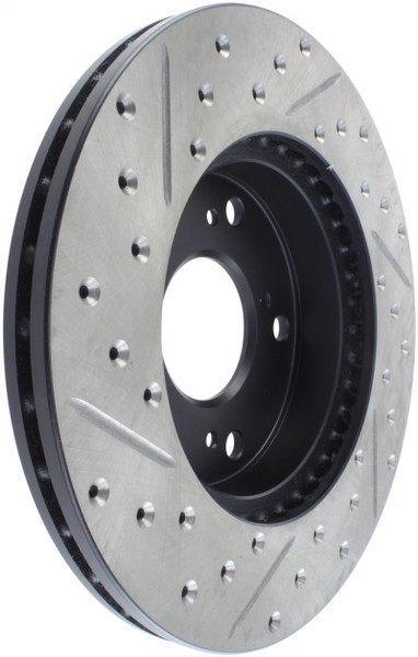 StopTech Drilled and Slotted Sport Rotors are 1-piece direct replacement brake discs for factory brake systems and stock calipers that look great behind your wheels – and offer significantly improved braking performance. The unique cross-drilling and slotting aids with heat and brake dust dispersal; prevents glazing of the pads; adds bite and improves wet and dry braking performance. Built to last; the black e-coating provides protection from corrosion and the high carbon metallurgy (in most applications) offers quieter operation; better crack resistance and increased performance.