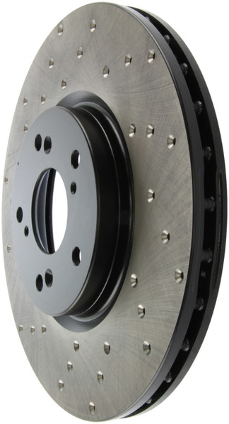 StopTech Drilled Sport Rotors are 1-piece direct replacement brake discs for factory brake systems and stock calipers that look great behind your wheels - and offer significantly improved braking performance. The unique cross-drilling aids with heat and brake dust dispersal; prevents glazing of the pads; adds bite and improves wet and dry braking performance. Built to last; the black e-coating provides protection from corrosion and the high carbon metallurgy (in most applications) offers quieter operation; better crack resistance and increased performance.