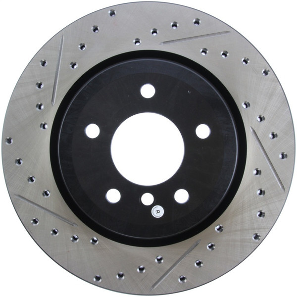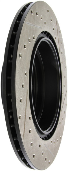 StopTech Drilled and Slotted Sport Rotors are 1-piece direct replacement brake discs for factory brake systems and stock calipers that look great behind your wheels - and offer significantly improved braking performance. The unique cross-drilling and slotting aids with heat and brake dust dispersal; prevents glazing of the pads; adds bite and improves wet and dry braking performance. Built to last; the black e-coating provides protection from corrosion and the high carbon metallurgy (in most applications) offers quieter operation; better crack resistance and increased performance.