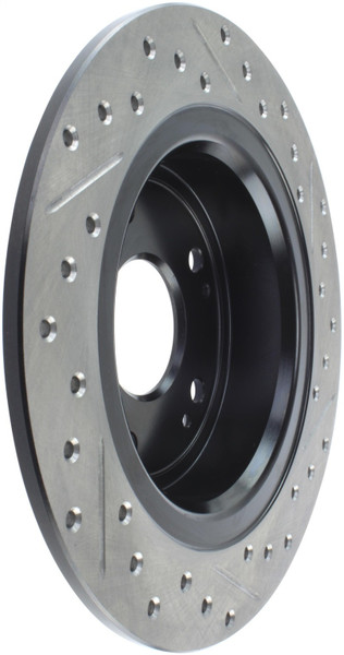StopTech Drilled and Slotted Sport Rotors are 1-piece direct replacement brake discs for factory brake systems and stock calipers that look great behind your wheels – and offer significantly improved braking performance. The unique cross-drilling and slotting aids with heat and brake dust dispersal; prevents glazing of the pads; adds bite and improves wet and dry braking performance. Built to last; the black e-coating provides protection from corrosion and the high carbon metallurgy (in most applications) offers quieter operation; better crack resistance and increased performance.
