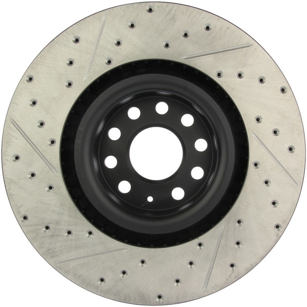 StopTech Drilled and Slotted Sport Rotors are 1-piece direct replacement brake discs for factory brake systems and stock calipers that look great behind your wheels - and offer significantly improved braking performance. The unique cross-drilling and slotting aids with heat and brake dust dispersal; prevents glazing of the pads; adds bite and improves wet and dry braking performance. Built to last; the black e-coating provides protection from corrosion and the high carbon metallurgy (in most applications) offers quieter operation; better crack resistance and increased performance.
