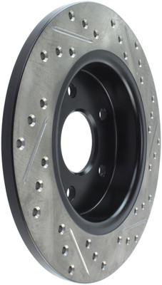 StopTech Drilled and Slotted Sport Rotors are 1-piece direct replacement brake discs for factory brake systems and stock calipers that look great behind your wheels – and offer significantly improved braking performance. The unique cross-drilling and slotting aids with heat and brake dust dispersal; prevents glazing of the pads; adds bite and improves wet and dry braking performance. Built to last; the black e-coating provides protection from corrosion and the high carbon metallurgy (in most applications) offers quieter operation; better crack resistance and increased performance.