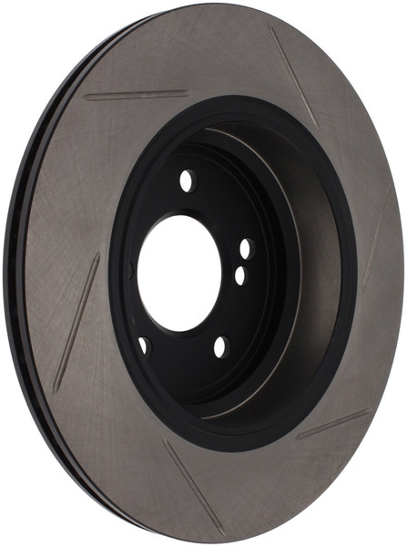 StopTech Slotted Sport Rotors are 1-piece direct replacement brake discs for factory brake systems and stock calipers that look great behind your wheels and offer significantly improved braking performance. The unique slotting aids with heat and brake dust dispersal; prevents glazing of the pads; adds bite and improves wet and dry braking performance. Built to last; the black e-coating provides protection from corrosion and the high carbon metallurgy (in most applications) offers quieter operation; better crack resistance and increased performance.