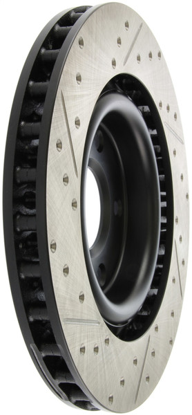 StopTech Drilled and Slotted Sport Rotors are 1-piece direct replacement brake discs for factory brake systems and stock calipers that look great behind your wheels - and offer significantly improved braking performance. The unique cross-drilling and slotting aids with heat and brake dust dispersal; prevents glazing of the pads; adds bite and improves wet and dry braking performance. Built to last; the black e-coating provides protection from corrosion and the high carbon metallurgy (in most applications) offers quieter operation; better crack resistance and increased performance.