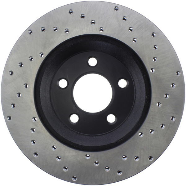 StopTech Drilled Sport Rotors are 1-piece direct replacement brake discs for factory brake systems and stock calipers that look great behind your wheels – and offer significantly improved braking performance. The unique cross-drilling aids with heat and brake dust dispersal, prevents glazing of the pads, adds bite and improves wet and dry braking performance. Built to last, the black e-coating provides protection from corrosion and the high carbon metallurgy (in most applications) offers quieter operation, better crack resistance and increased performance.