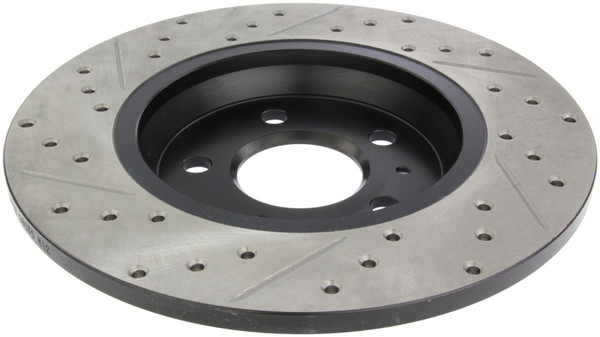 StopTech Drilled and Slotted Sport Rotors are 1-piece direct replacement brake discs for factory brake systems and stock calipers that look great behind your wheels - and offer significantly improved braking performance. The unique cross-drilling and slotting aids with heat and brake dust dispersal; prevents glazing of the pads; adds bite and improves wet and dry braking performance. Built to last; the black e-coating provides protection from corrosion and the high carbon metallurgy (in most applications) offers quieter operation; better crack resistance and increased performance.