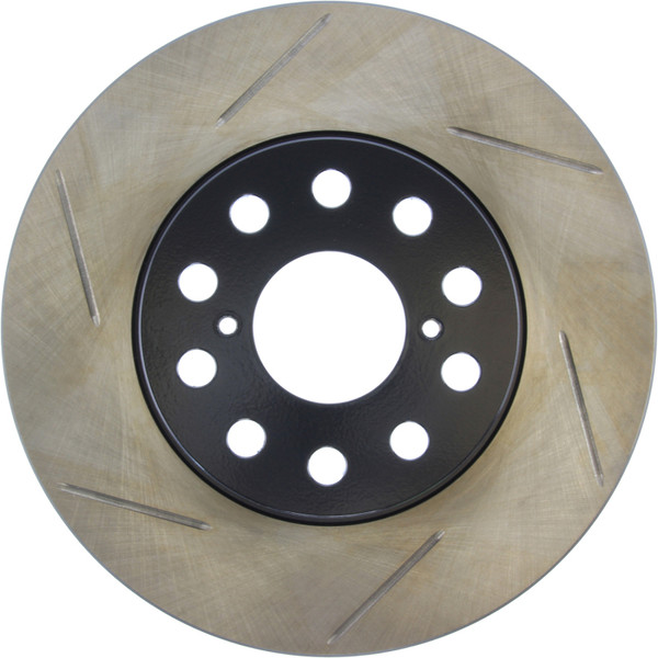 StopTech Slotted Sport Rotors are 1-piece direct replacement brake discs for factory brake systems and stock calipers that look great behind your wheels - and offer significantly improved braking performance. The unique slotting aids with heat and brake dust dispersal; prevents glazing of the pads; adds bite and improves wet and dry braking performance. Built to last; the black e-coating provides protection from corrosion and the high carbon metallurgy (in most applications) offers quieter operation; better crack resistance and increased performance.