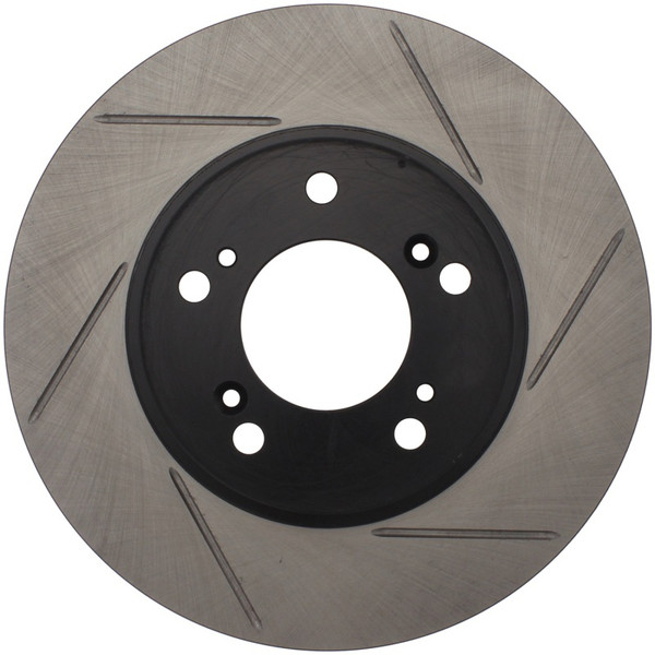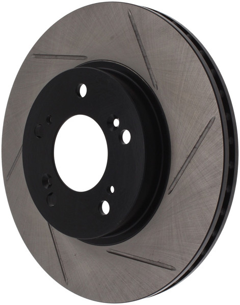 StopTech Slotted Sport Rotors are 1-piece direct replacement brake discs for factory brake systems and stock calipers that look great behind your wheels - and offer significantly improved braking performance. The unique slotting aids with heat and brake dust dispersal; prevents glazing of the pads; adds bite and improves wet and dry braking performance. Built to last; the black e-coating provides protection from corrosion and the high carbon metallurgy (in most applications) offers quieter operation; better crack resistance and increased performance.