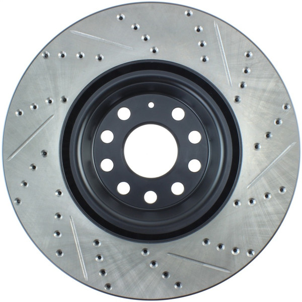 StopTech Drilled and Slotted Sport Rotors are 1-piece direct replacement brake discs for factory brake systems and stock calipers that look great behind your wheels - and offer significantly improved braking performance. The unique cross-drilling and slotting aids with heat and brake dust dispersal; prevents glazing of the pads; adds bite and improves wet and dry braking performance. Built to last; the black e-coating provides protection from corrosion and the high carbon metallurgy (in most applications) offers quieter operation; better crack resistance and increased performance.