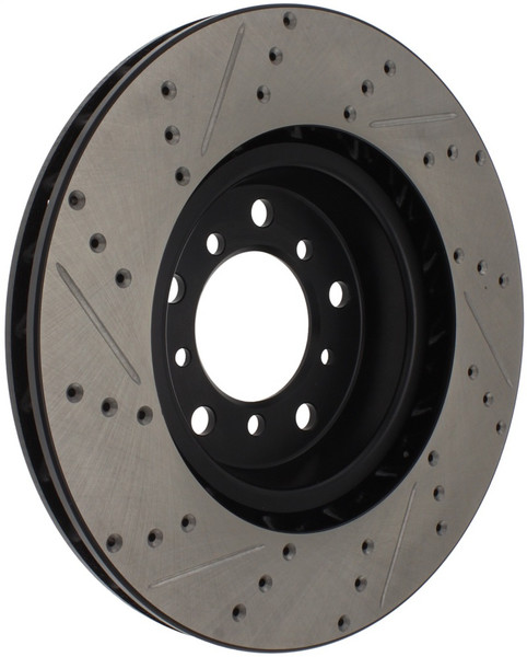 StopTech Drilled and Slotted Sport Rotors are 1-piece direct replacement brake discs for factory brake systems and stock calipers that look great behind your wheels and offer significantly improved braking performance. The unique cross-drilling and slotting aids with heat and brake dust dispersal; prevents glazing of the pads; adds bite and improves wet and dry braking performance. Built to last; the black e-coating provides protection from corrosion and the high carbon metallurgy (in most applications) offers quieter operation; better crack resistance and increased performance.
